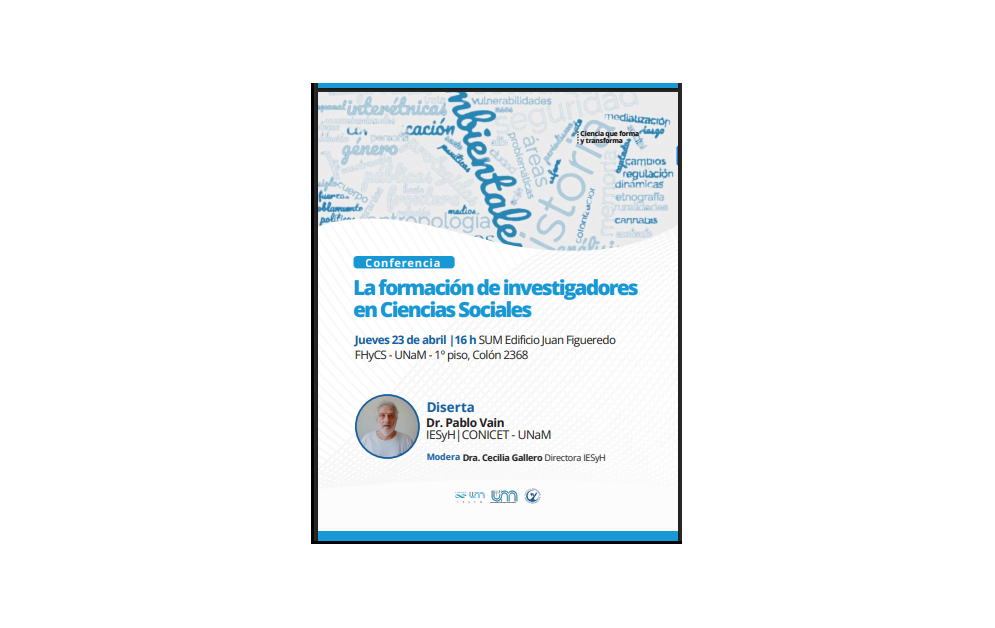 El próximo 23 de abril, el Instituto de Estudios Sociales y Humanos (IESyH – CONICET/UNaM) dará inicio al ciclo académico 2026 con la conferencia “La formación de investigadores en ciencias sociales”, a cargo del Dr. Pablo Vain. La actividad se realizará a las 16 hs en el SUM del edificio Juan Figueredo (1.º piso, Colón 2368), Facultad de Humanidades y Ciencias Sociales (UNaM).