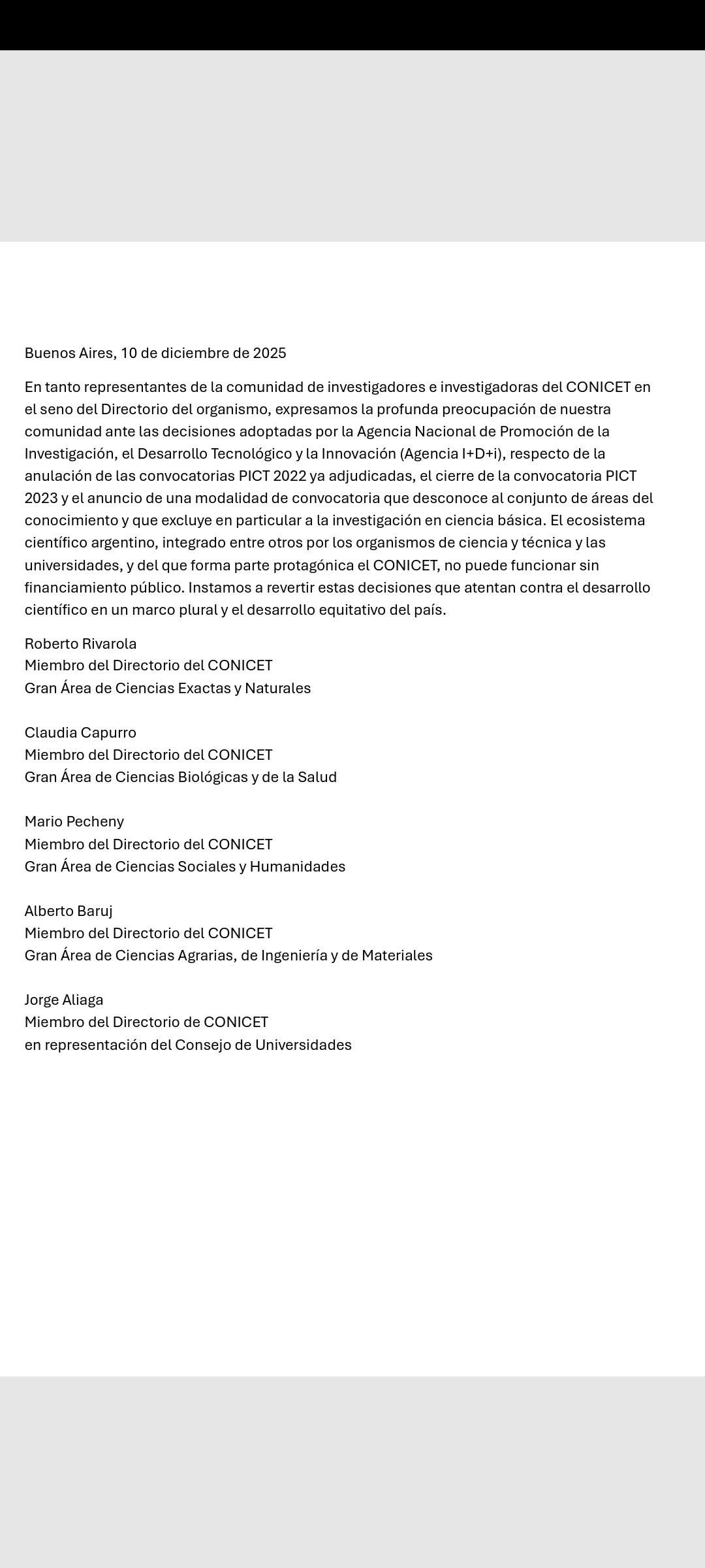 En el texto, los cinco miembros en representación de diferentes áreas de investigación y del Consejo de Universidades expresaron su “profunda preocupación” por “la anulación de las convocatorias PICT 2022 ya adjudicadas, el cierre de la convocatoria PICT 2023 y el anuncio de una modalidad de convocatoria que desconoce al conjunto de áreas del conocimiento y que excluye en particular a la investigación en ciencia básica”.